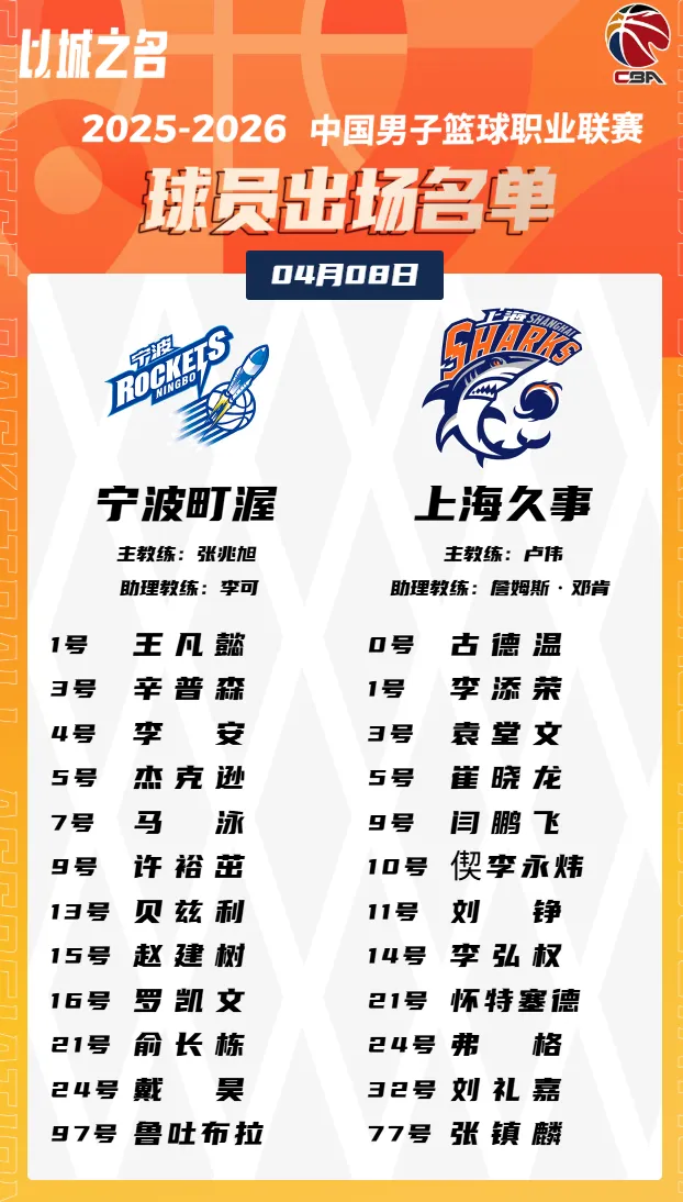 虎扑04月08日讯 今晚CBA常规赛,宁波对阵上海的大名单已经出炉。